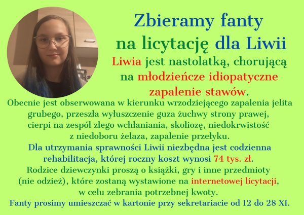 Ogłaszamy zbiórkę fantów dla Liwii Kolińskiej, która dzielnie walczy o zdrowie i utrzymanie sprawności. Dołączmy do grona osób wspierających tę dzielną chojniczankę! Liczymy na Wasze wielkie serca!!! Dziękujemy!