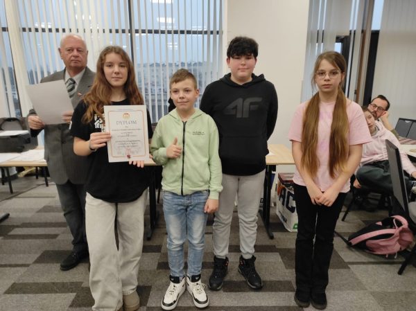 klasy 7-8 – Marcin Wojciechowski, Wiktor Urowski, Hubert Ryzop, Zuzanna Kołomyjska.